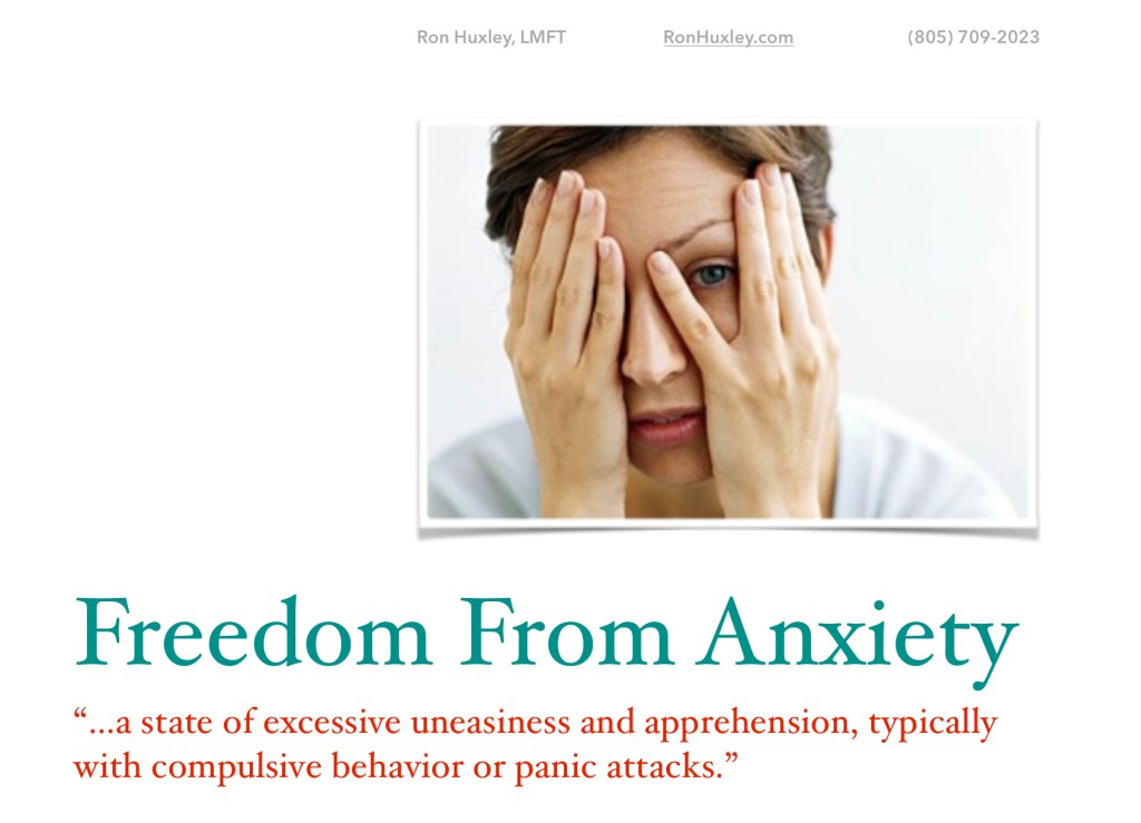 Let Ron Huxley, LMFT help you with anxiety, fear, worry, and panic now by scheduling an appointment today. Click here to find a convenient time to find your breakthrough with Ron.